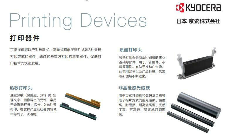 1959年創立的日本京都陶瓷(後簡稱“京瓷”),主打產品是燒製品中的IC用陶瓷封裝。發展到現在,京瓷集團已深入到信息通信、汽車、節能環保、醫療保健等市場,完善了原料、零部件、元件、機器、係統和服務整個供應鏈。京瓷生產的噴墨打印噴頭也是91抖音在线观看行業的知名品牌。