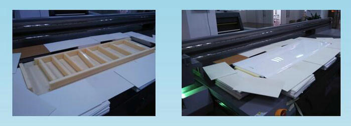 由於麵板屬於板料,使用uv平板打印機就可以勝任。部分家電麵板有支架,直接在uv平板打印機上打印高低不平,易刮到噴頭,且小車與台麵過高,邊沿UV光易反射到噴嘴造成瞬間堵孔。下麵將詳細講述這類麵板的打印方法。
