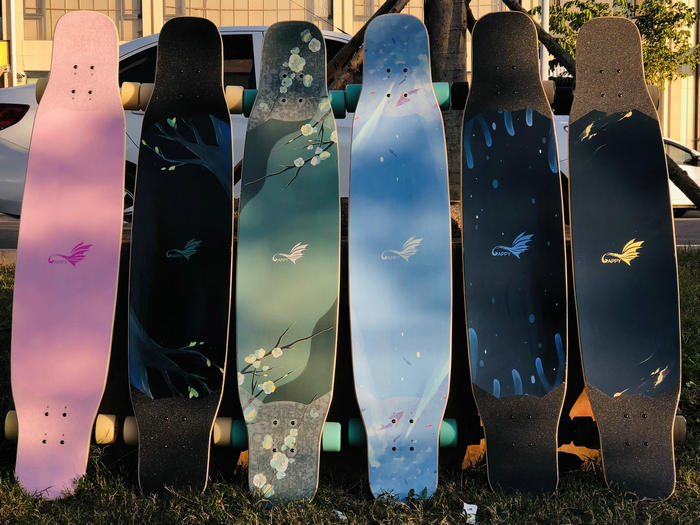 滑板主要是由板麵、橋(支架)、輪子、軸承、砂紙等組成。而板麵是滑板辨識度最高的部分,不同的板麵材質和圖案帶給人不同的感官體驗。現在的很多的玩具滑板,主要也是靠“顏值”獲得了不錯的市場銷量,甚至超過專業滑板。那也是為什麽滑板廠商越來越重視板麵圖案的設計和製作,也讓UV平板打印機這種換圖靈活、無需製版、即打即幹的工具應用到產品製作過程中。
